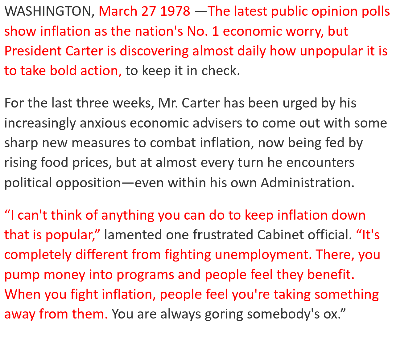 No one knows better than former President Jimmy Carter, who presided over the highly inflationary late 1970s. This an excerpt from a NYT article in 1978: