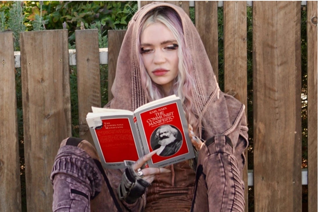 It’s not only debates on wokeness, but also images like the one below - paparazzi shots of Elon Musk’s wife this weekend, artist Grimes parading the streets of L.A. with an edition of Karl Marx’s “Communist Manifesto”