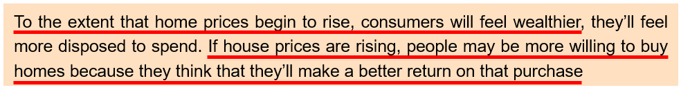People who own these assets feel wealthier as their price goes up. The theory goes that this triggers them to spend more, and this increased spending benefits everyone
