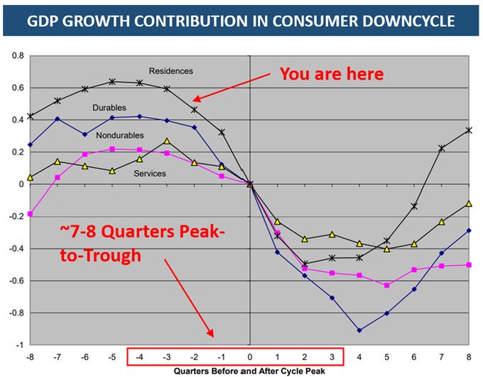 Coming back to the economic cycle, pictured below (see “Consumer Cycle, not Business Cycle” for details), please note the steeper slope ahead, the data implies we are likely on its precipice