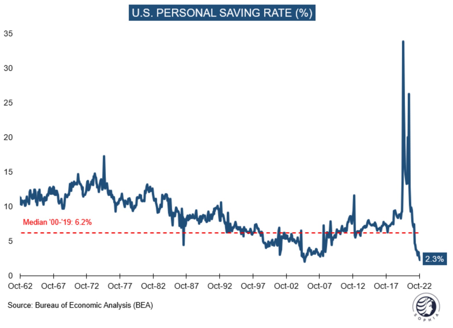 US Consumer - After a very tepid start to November, Black Friday sales turned out in line for physical stores and better than expected for ecommerce amid heavy discounting. The jury is still out on US consumer strength, but I would highlight the following: October ‘23 showed the second lowest personal savings rate on record, clearly an unsustainable state. Pandemic excess savings run out by mid-’23, with lower-income demographics already maxed out. If anything, the US Consumer lives on borrowed time