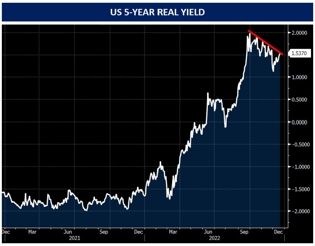 With credit distress looming large, I believe we are past the point of maximum Central Bank hawkishness. This hawkishness can be measured via real yields, which are nominal yields minus inflation expectations. If Central Banks are very aggressive, they increase nominal yields above inflation, if they become less aggressive than before, the real yield declines - I believe we are at this point now