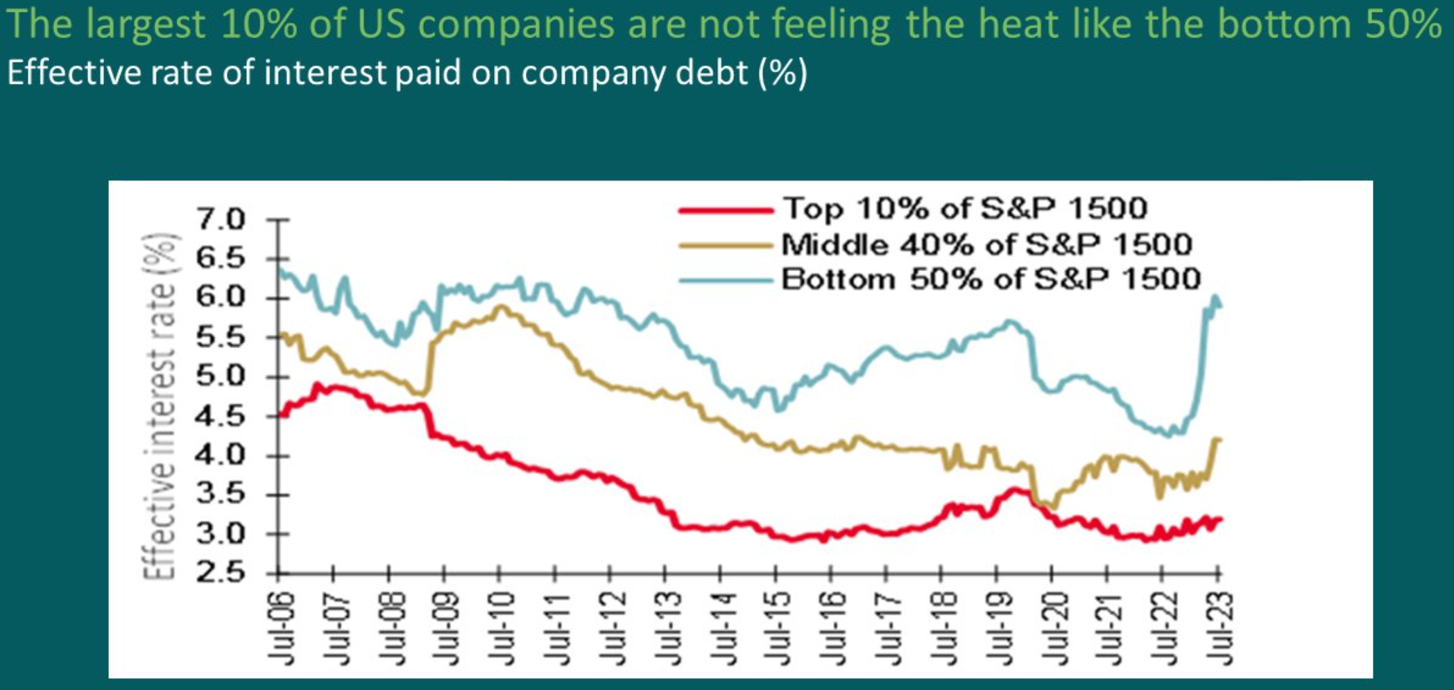 Today, large parts of the US economy have no leverage issue, in particular households and large corporations. For small caps, the picture is more challenging, they haven’t termed out debt as aggressively and are generally more levered