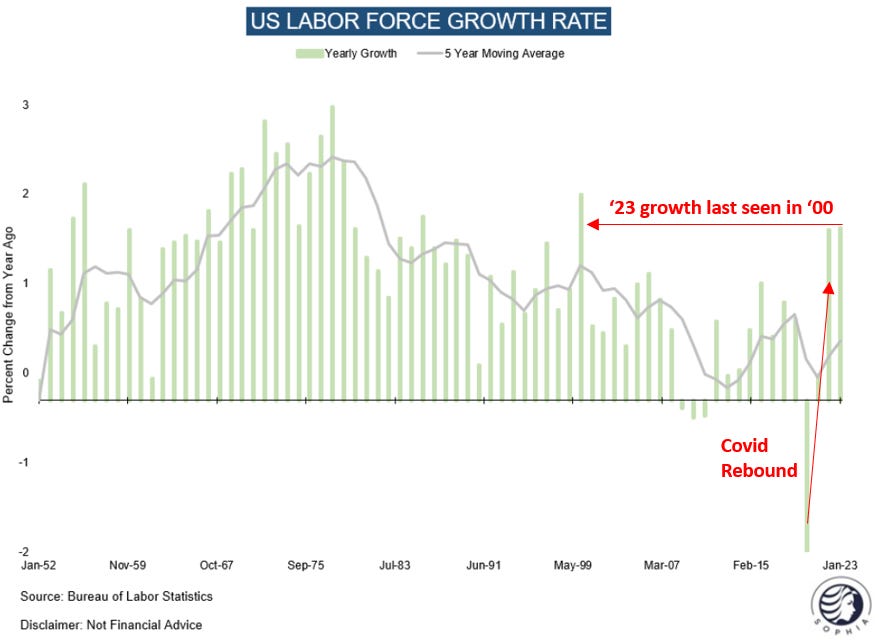 However, those who left during Covid-19 have now come back. Thus, the US labor force has actually expanded at a healthy pace in ‘22 and ‘23