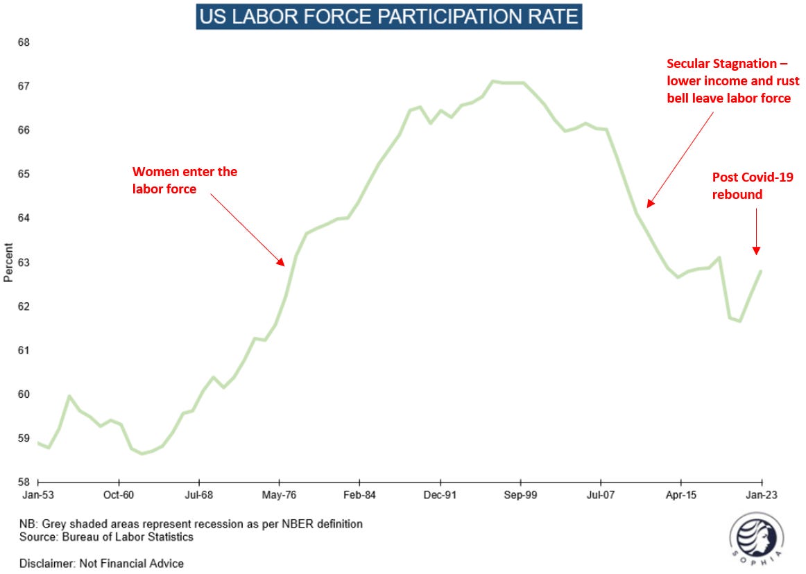 After the Great Financial Crisis, a steep decline occurred. This period of secular stagnation confronted especially lower income groups with a dissatisfying opportunity set, and many turned their back on work