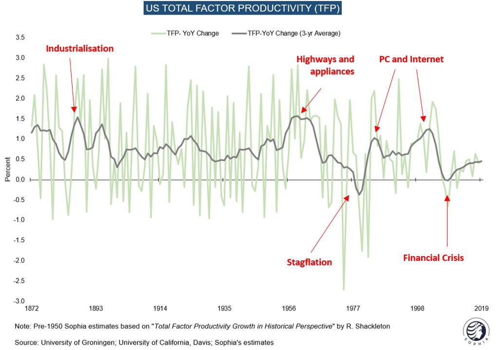 The PC in the 80s and the internet in the 90s added c. 1% p.a. to GDP growth for several years. In the 1960s, the interstate highways system and kitchen appliances such as fridges or washing machines provides a similar boost