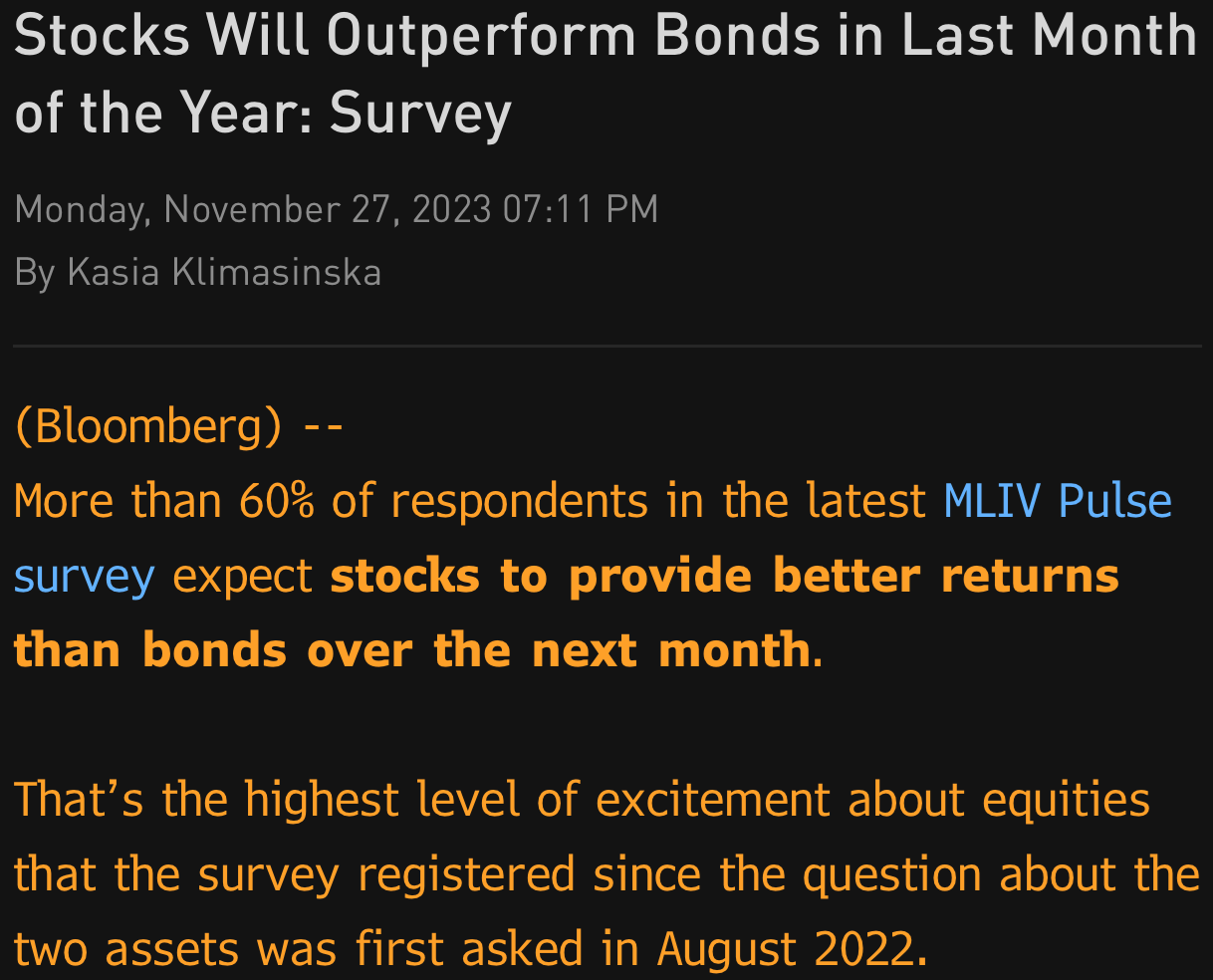 Now, most investors have made up their mind, and according to this recent Merrill Lynch survey expect stocks to do better than bonds (= soft landing), with the highest degree of conviction in the survey’s albeit short history