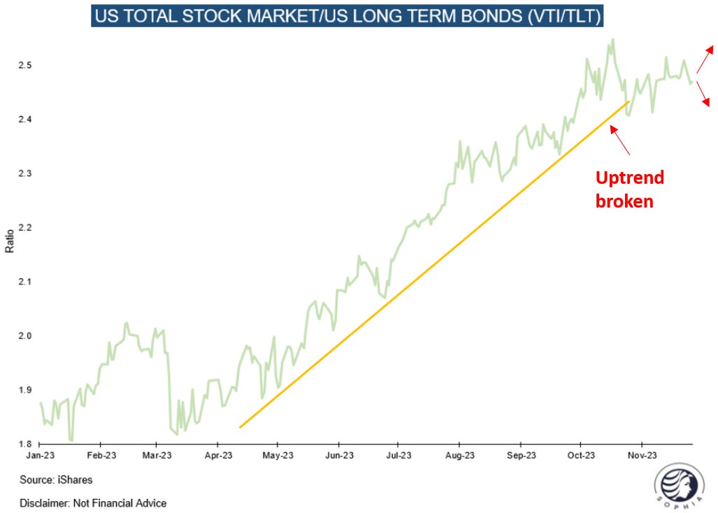 For this, in particular, there is one chart that I pay great attention to: The ratio of stocks vs bonds, as measured by VTI (US total stock market cap) vs TLT (long duration US Treasury bonds)