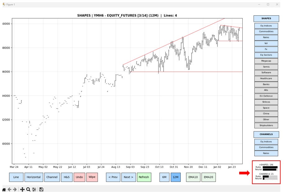 In order to expand, I am training the terminal to read charts like me. The red box at the bottom with the arrow counts the # of samples the machine needs to replicate my technique both (1) via standard coordinate settings and (2) via image recognition, i.e. a neural network. So over time, the machine will have seen enough examples from me to read them the same way, and I can have it go through 1000s of assets instead of the currently 120 I scan every day