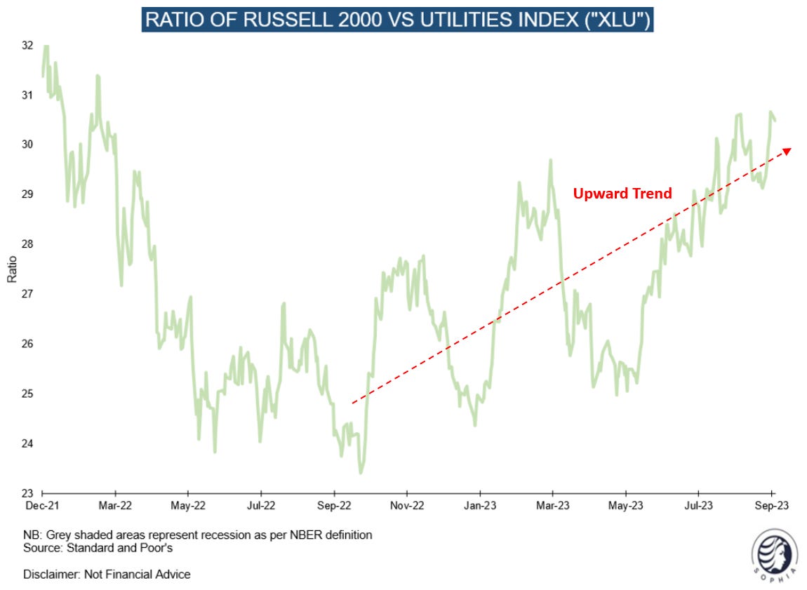 Similarly, comparing growth sensitive sectors to their opposite suggests a pick up in growth is under way (Russell 2000 vs Utilities below). Again, this ratio unlikely moves in a straight line and the Fall may see another ebb after the recent flow, but the primary trend appears up