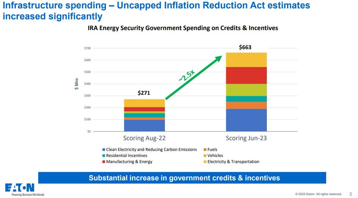 Just take the Inflation Reduction Act as an example, where subsidies for new manufacturing capacity continue to grow rapidly given the programs uncapped nature - its size has almost tripled in less than a year! (slides below from Eaton Industries, one of the biggest beneficiaries of said trend)