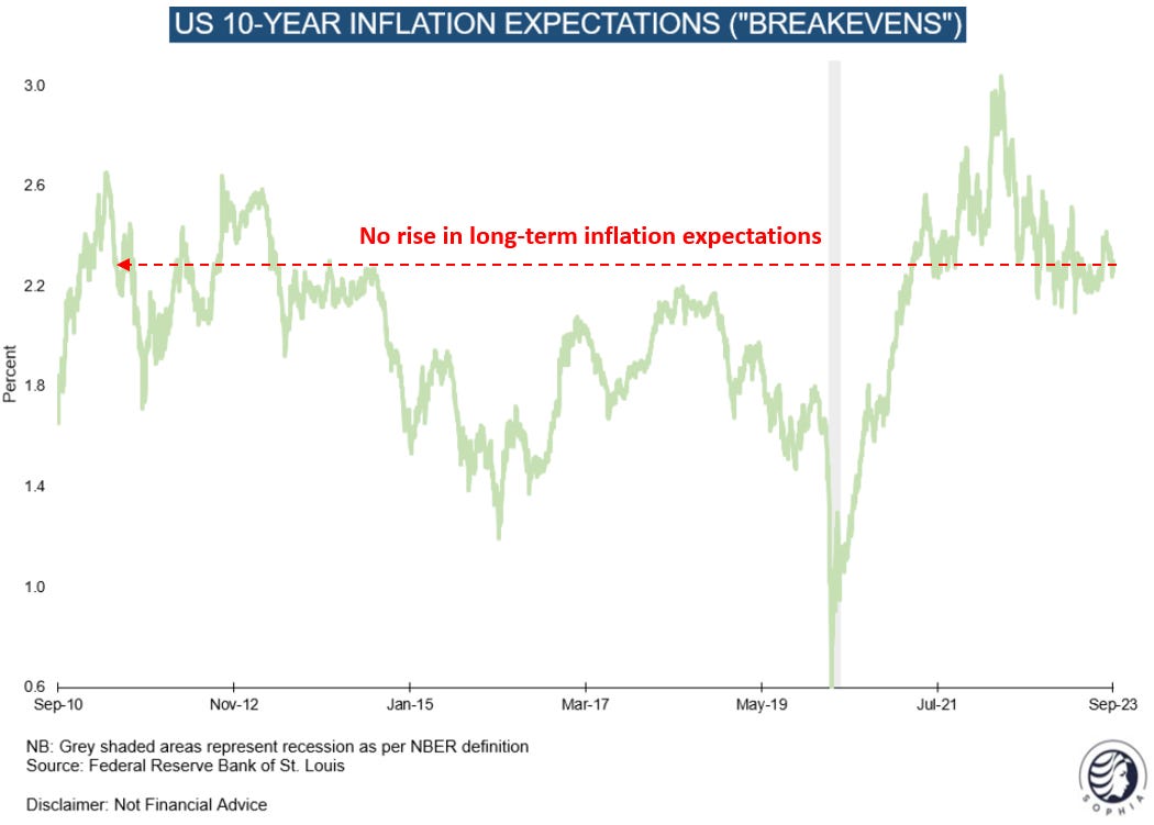 As the below chart shows, 10-year inflation expectations are stuck at ~2.3%, pretty standard in historical comparison, and in fact well below their peak