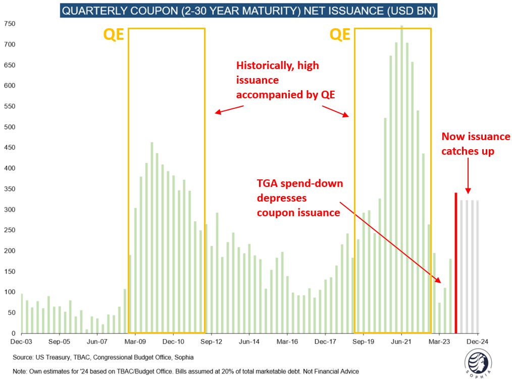 As I had written in various recent posts, long-end supply has grown enormously this past quarter. The deficit needs to be funded, and a catch-up is necessary after the debt ceiling has passed