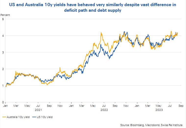 Australian 10-year yields evolved almost identical to the US. Unlike the US, the country is on track to have a budget surplus. So no sign of supply impact there