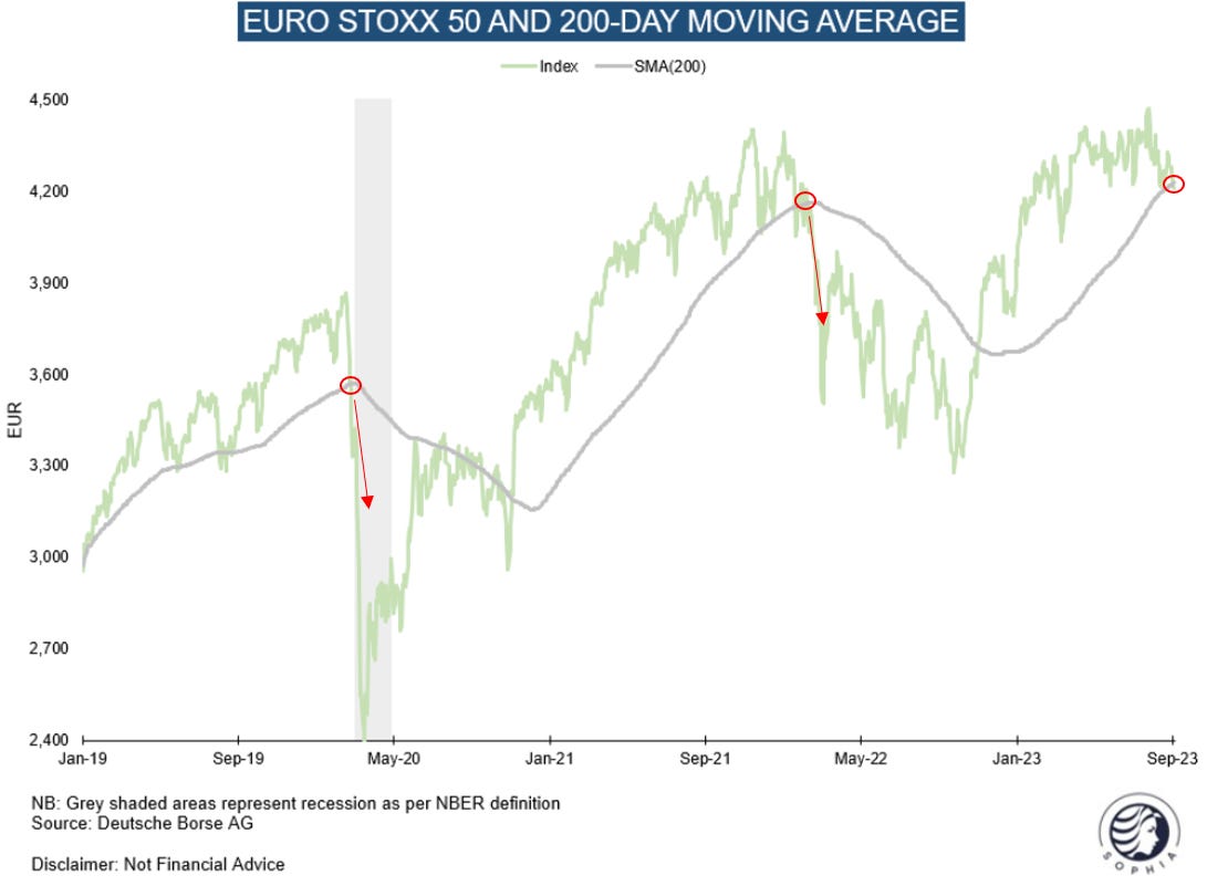 As mentioned in recent posts, I expect September and October to be a stormy period. This is not based on calendarial superstition, but because some individual and corporate tax payments are due over that period, which drains liquidity from the private sector. At the same time, we have seen a deluge of new issuance announced, from the ARM IPO to new high yield bonds. For this reason I have raised more cash by cutting the small regional banks position as these breached their upward trend, and added Euro Stoxx 50 shorts as various EU indices have dropped below the 200-day moving average, while the area is globally the weakest and likely the first to be sold should liquidity contract further. I am keeping my holding in China Tech which is volatile but I see no reason to change my thinking, and some small energy
