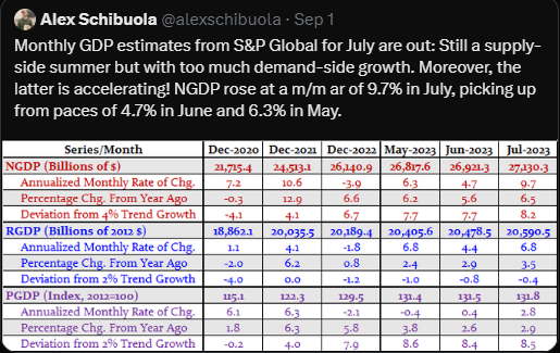 Coincident economic data is running hot, such as the July US GDP print that S&P Global sees running at an annualised 9%+ (!)